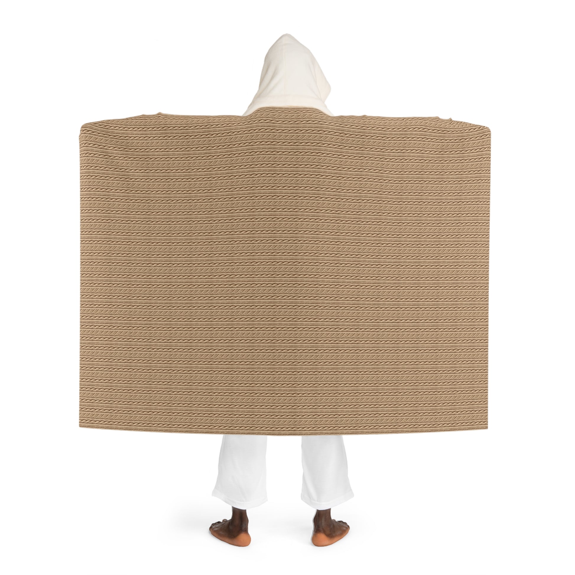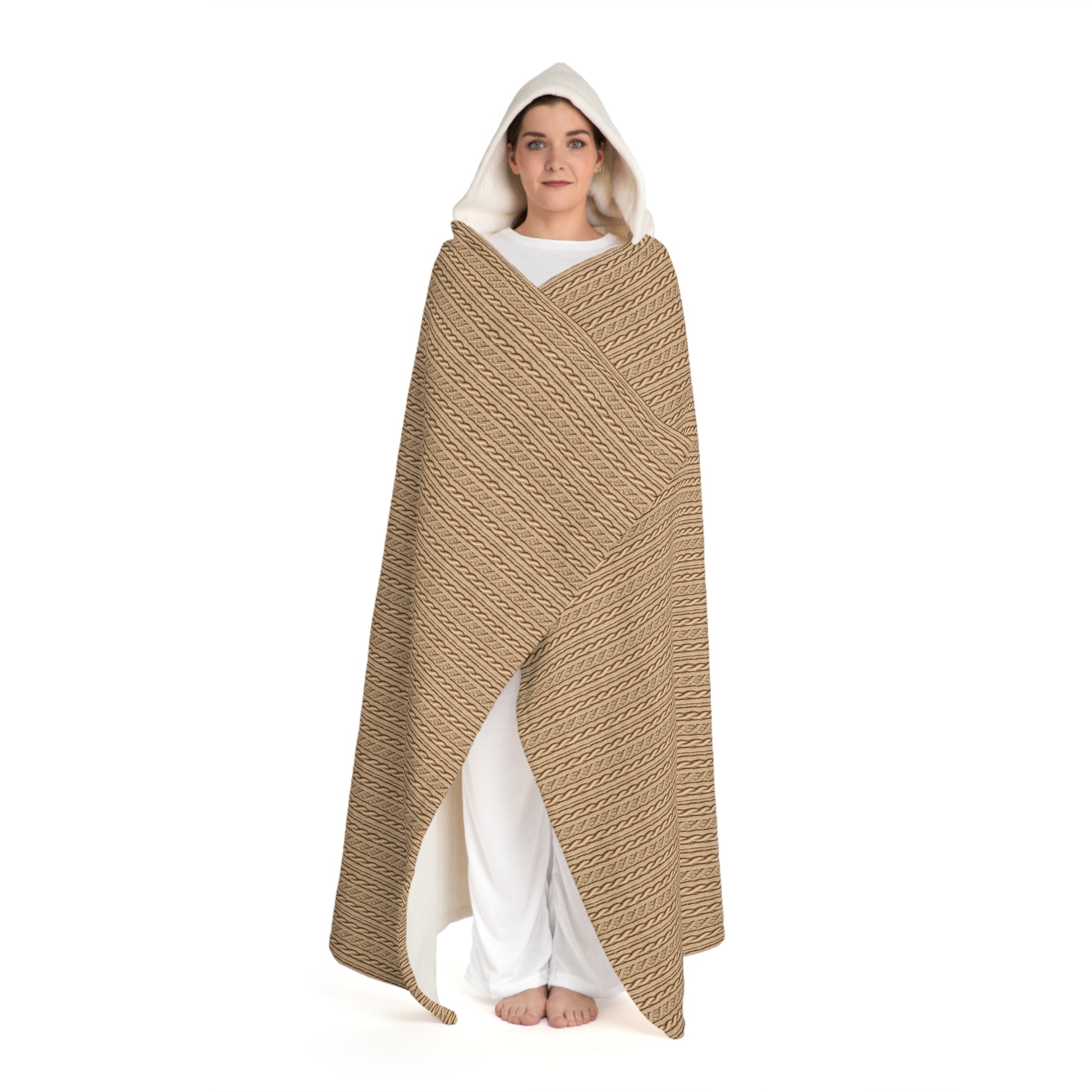 Stay cozy and warm with this Hooded Blanket Soft Sherpa featuring a faux cable knit pattern in tan. Perfect for snuggling up on cold nights or lounging around the house. Ideal for anyone looking for comfort and style during the winter season.